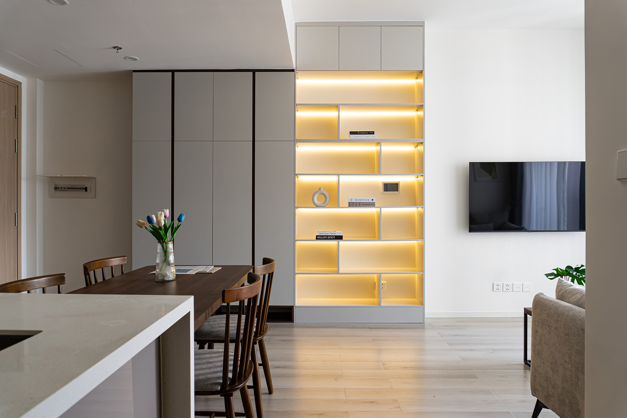 - Thi công Phòng Khách & Bếp: Lắp đặt sofa màu xám trung tính, bàn trà gỗ tối màu. Thi công tủ bếp chữ I hoặc chữ L với cánh tủ màu trắng/kem và mặt bếp màu trắng, tích hợp tủ lạnh lớn. Thiết kế khu vực tủ kệ trang trí âm tường màu trắng, có đèn hắt vàng tạo điểm nhấn ấm áp.
