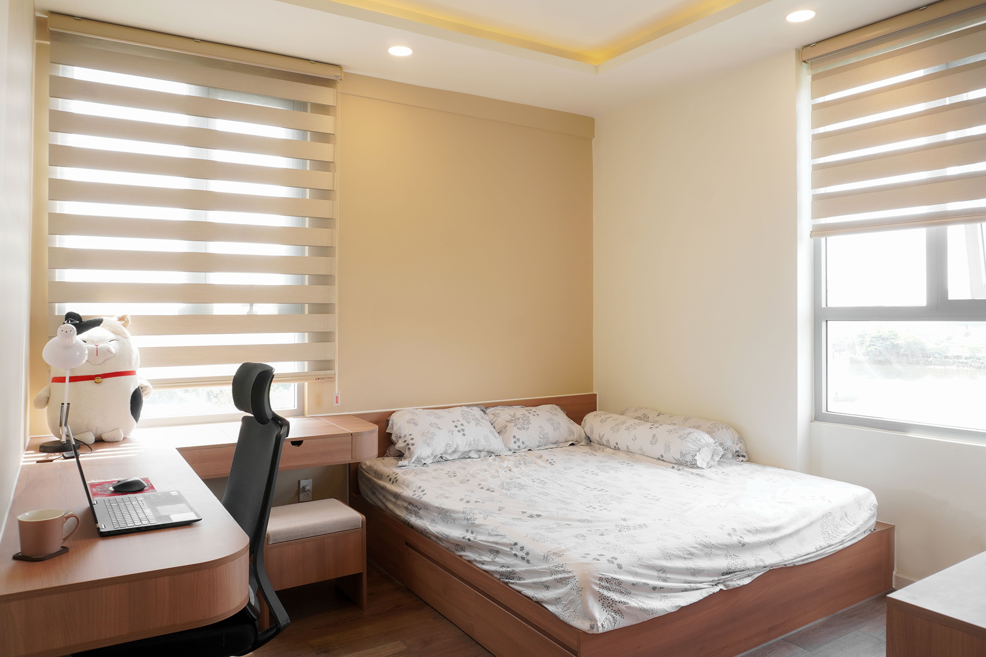- Ánh sáng: Sử dụng rèm cuốn hoặc rèm sáo để kiểm soát ánh sáng tự nhiên một cách linh hoạt, kết hợp đèn bàn học và đèn downlight âm trần.