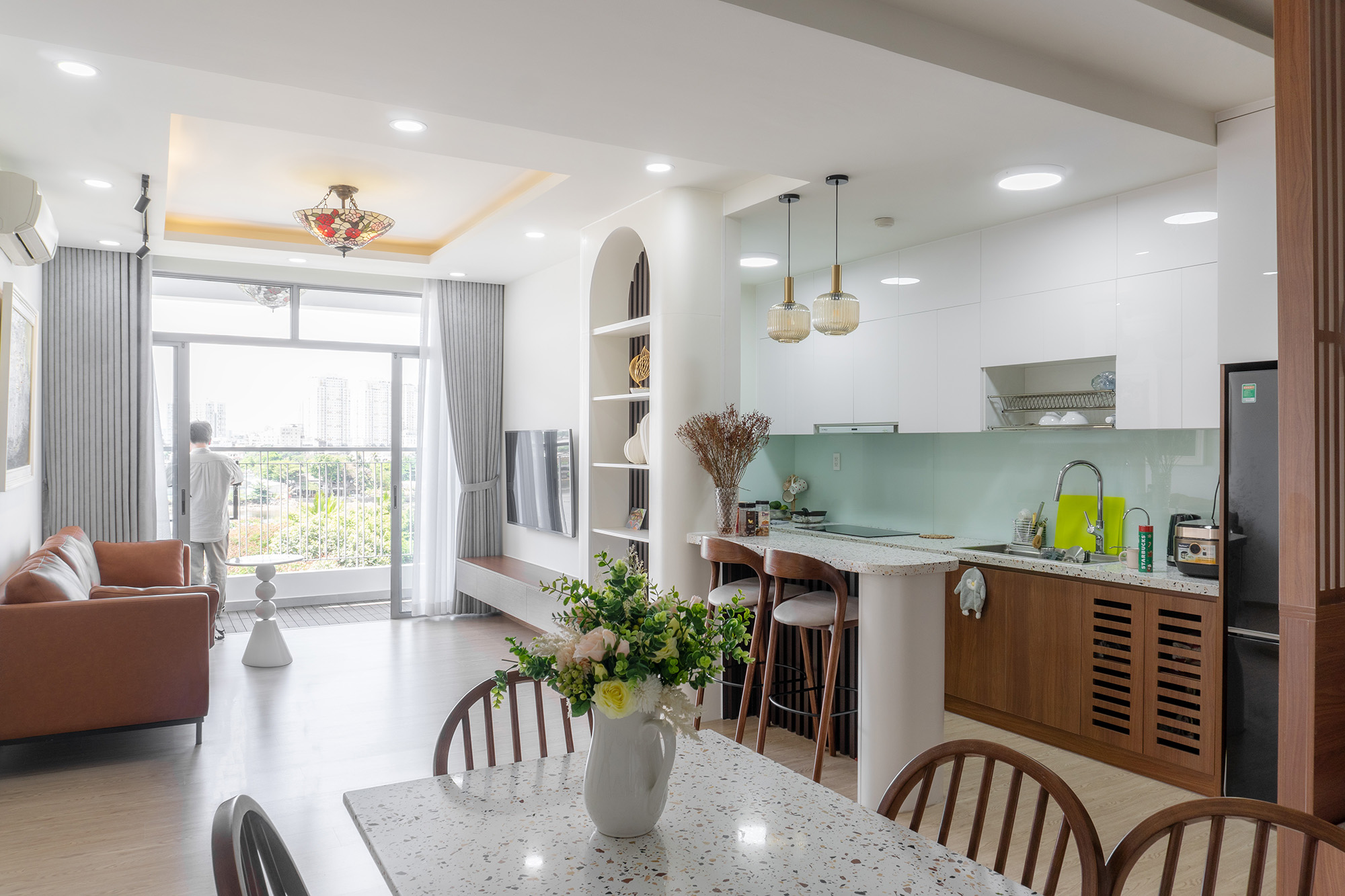 - Thi công Phòng Khách: Lắp đặt vách kệ TV và tủ trang trí có các đường cong mềm mại và kệ mở. Sử dụng chất liệu gỗ công nghiệp vân gỗ ấm. Thi công trần thạch cao kết hợp đèn hắt vòng cung để tạo điểm nhấn nghệ thuật.