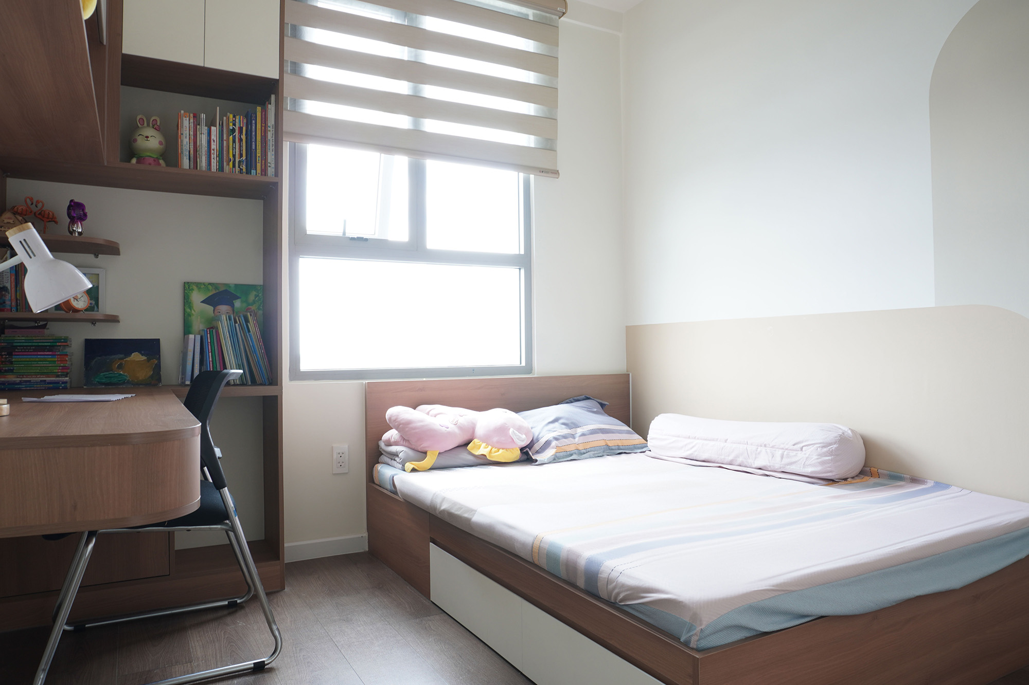 - Nội thất Phòng Ngủ: Thiết kế và thi công nội thất phòng ngủ trẻ em theo mô hình thông minh. Giường ngủ được đặt sát tường, kết hợp bàn học liền tủ hoặc bàn học treo tường để tiết kiệm diện tích sàn. Tủ quần áo và kệ sách được thiết kế kịch trần với tông màu trắng và gỗ sáng.