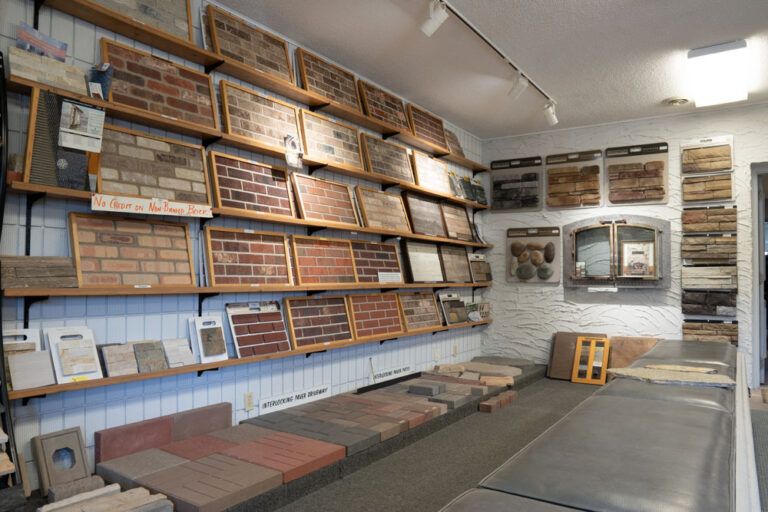 - Vách kệ: Thi công các hệ thống kệ chia ô vuông hoặc chữ nhật, tận dụng tối đa chiều cao để trưng bày số lượng mẫu lớn, bao gồm cả gạch, đá và các tấm ván nội thất.