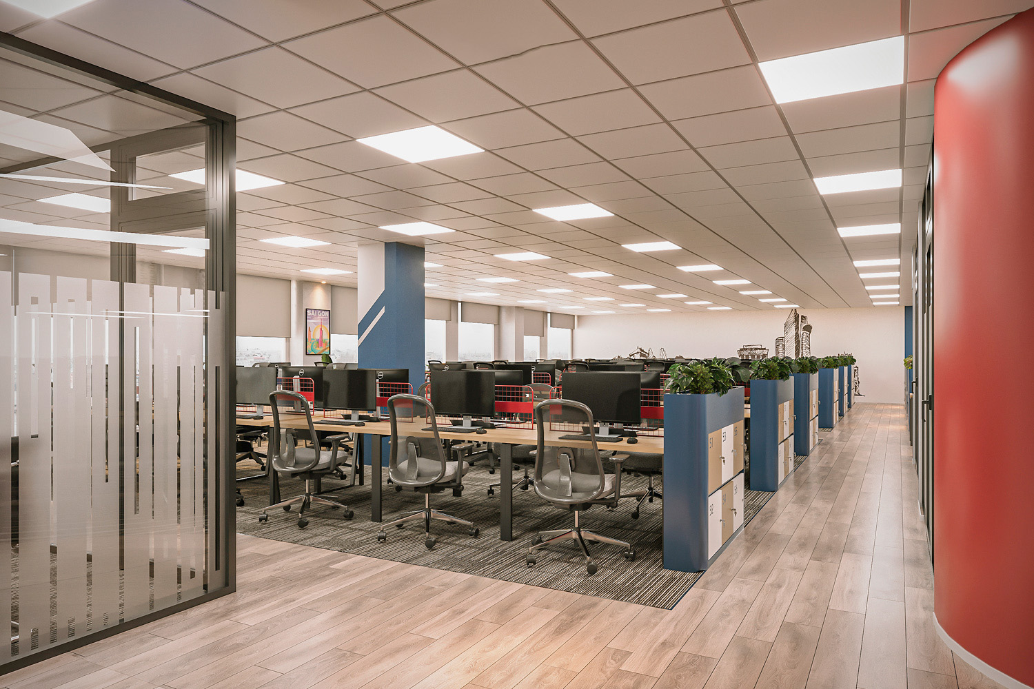 Nội thất Module: Sản xuất và lắp đặt bàn làm việc module có vách ngăn màu xanh dương/ghi xám. Thi công tủ locker cá nhân (màu xanh dương) tích hợp vào cột hoặc khu vực phân chia không gian.