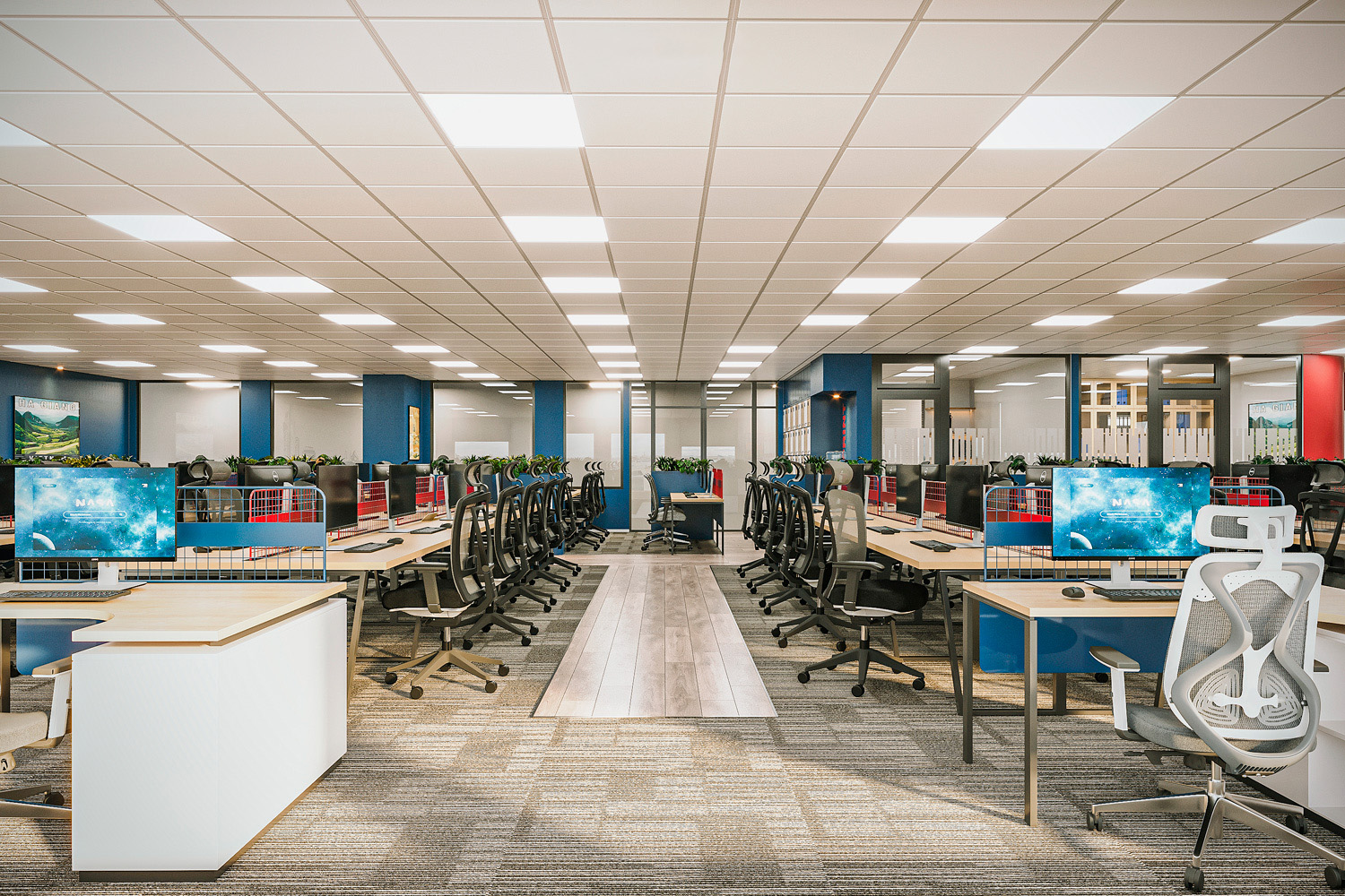 Sàn: Lắp đặt thảm sàn màu xám đậm, tối ưu hóa sự yên tĩnh cho khu vực làm việc.