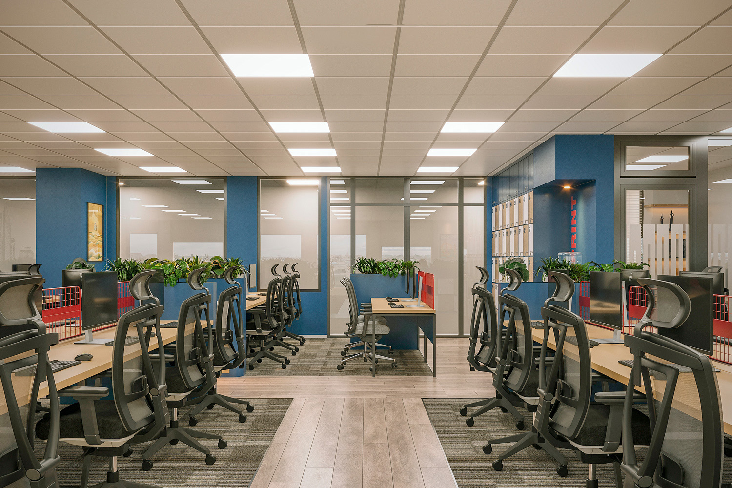 Tường và Ánh sáng: Sơn tường và cột màu xanh dương theo tông màu thương hiệu. Lắp đặt hệ thống đèn panel LED và đèn trang trí hiện đại.