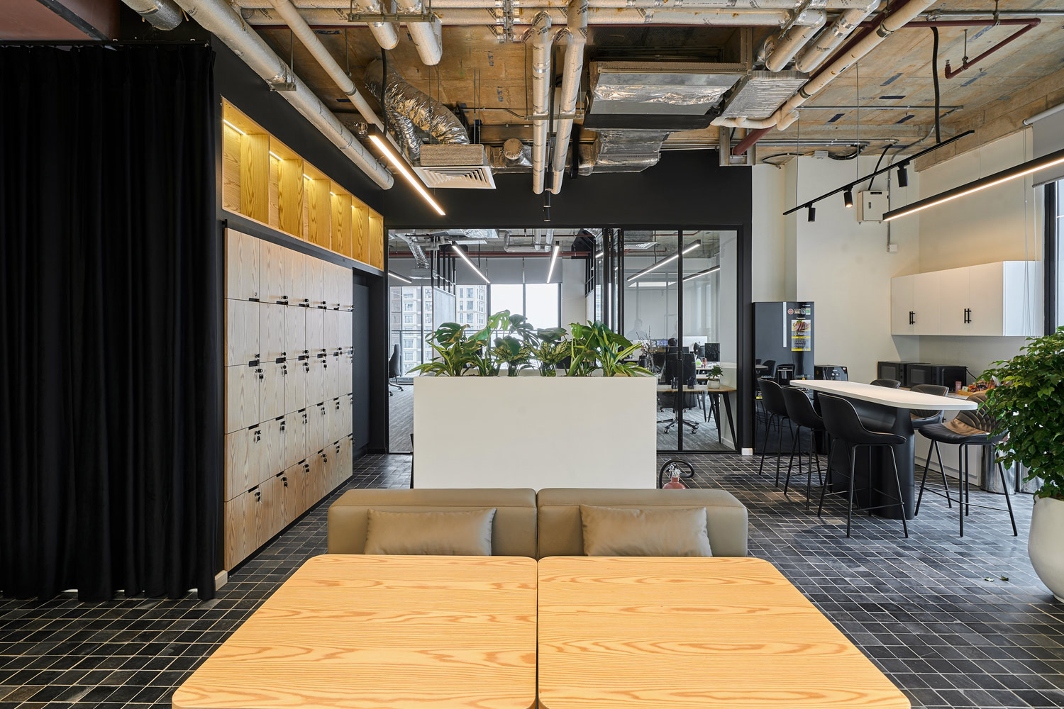 - Không gian Chức năng: Bố trí khu vực ghế chờ/ghế nghỉ dọc tường với đệm da màu nâu ấm, tạo không gian thư giãn hoặc làm việc nhóm linh hoạt.