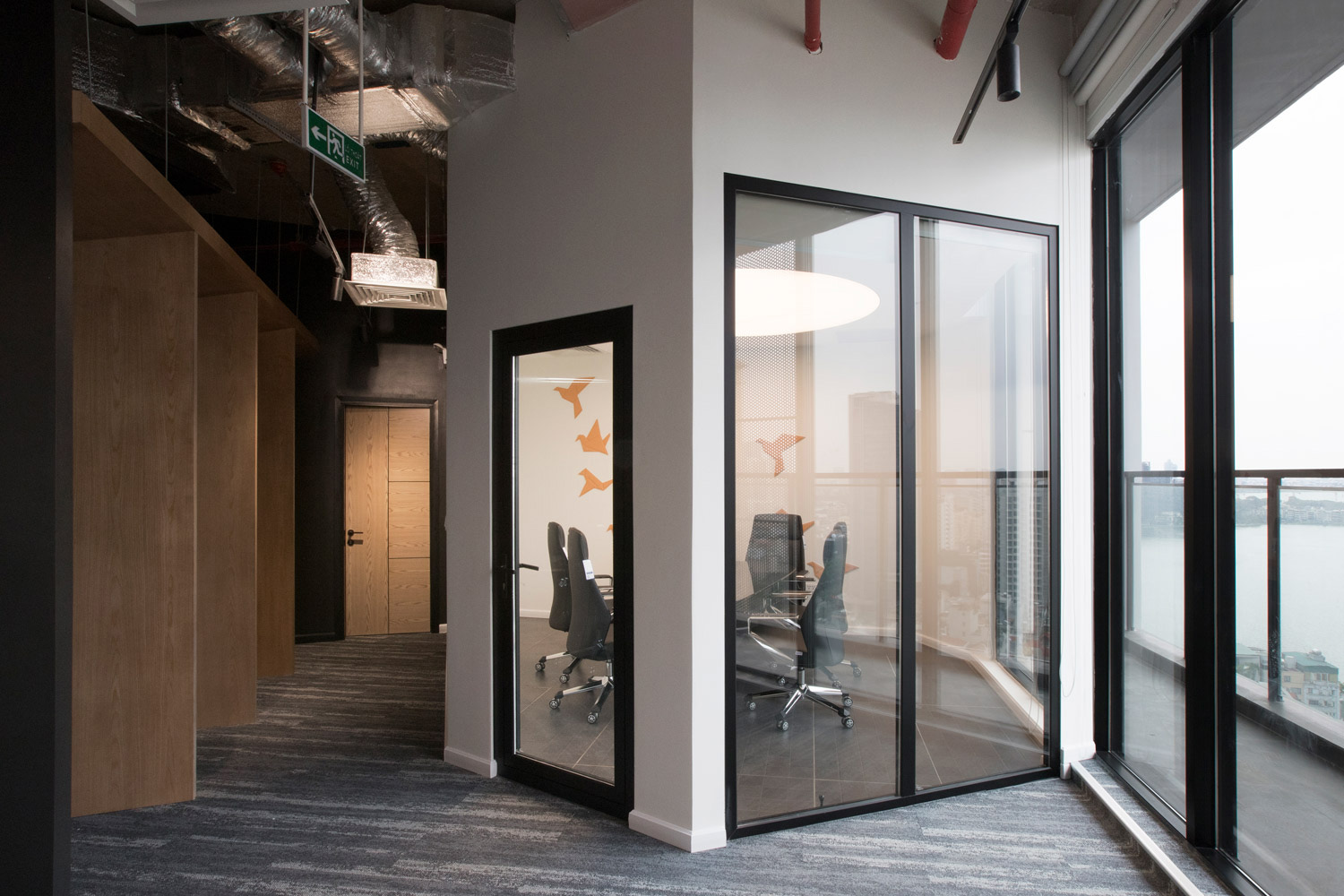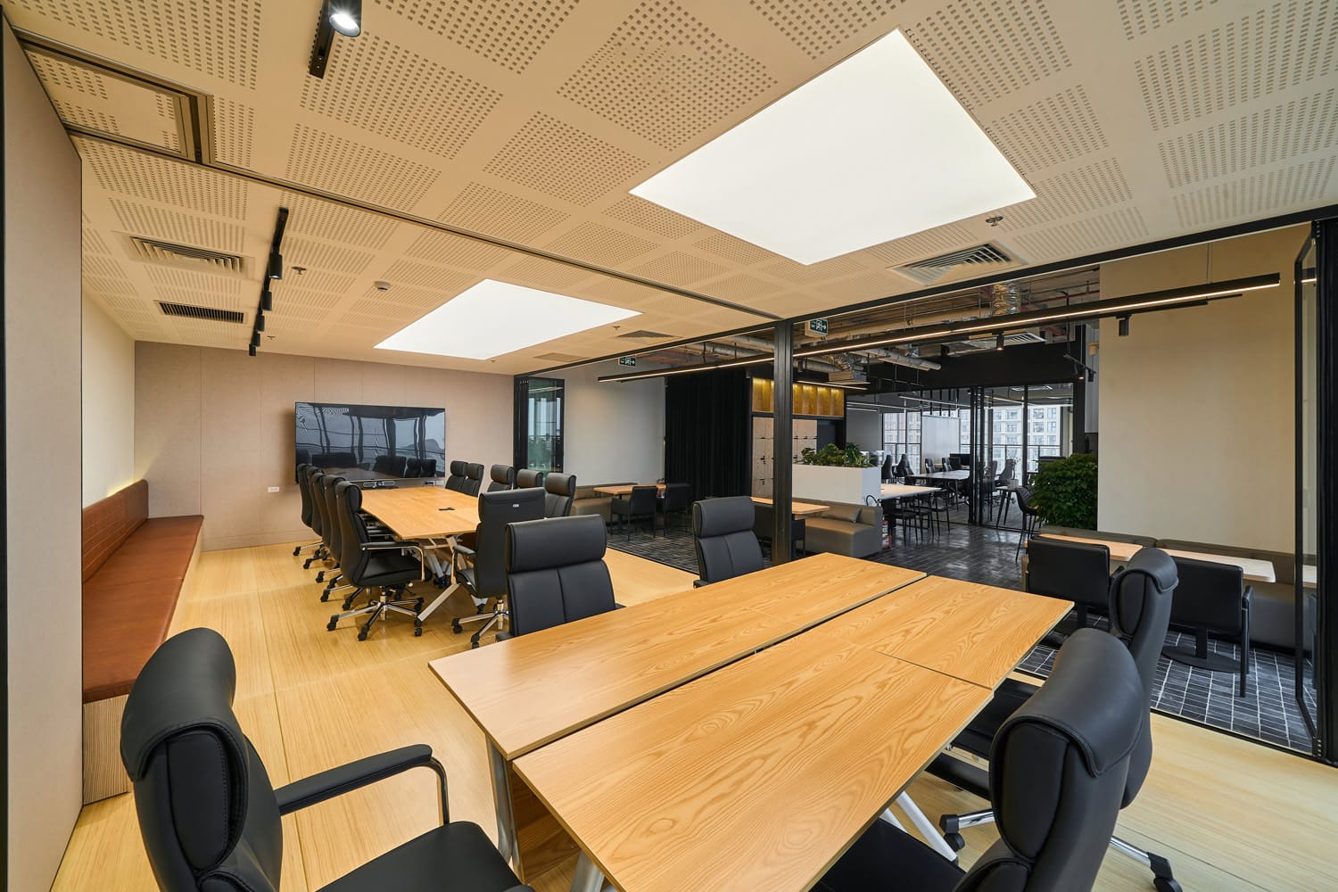 - Vách ngăn & Cách âm: Lắp đặt vách kính cường lực viền đen để phân chia không gian, vẫn giữ được sự thông thoáng nhưng đảm bảo cách âm tương đối cho phòng họp.