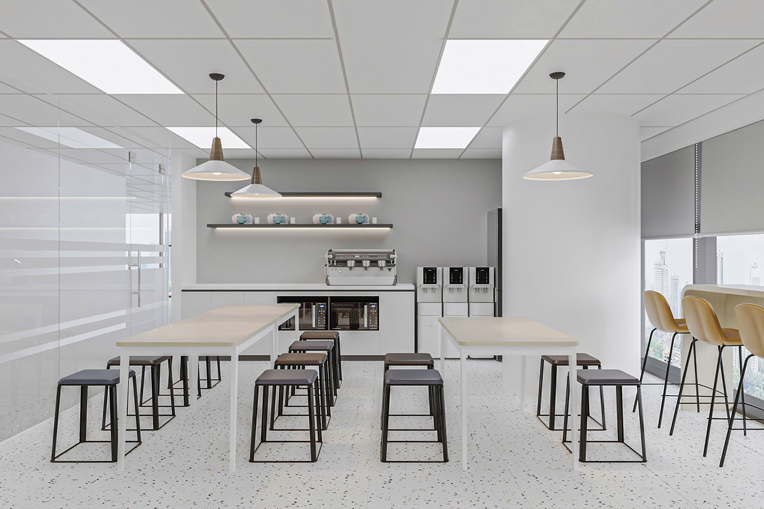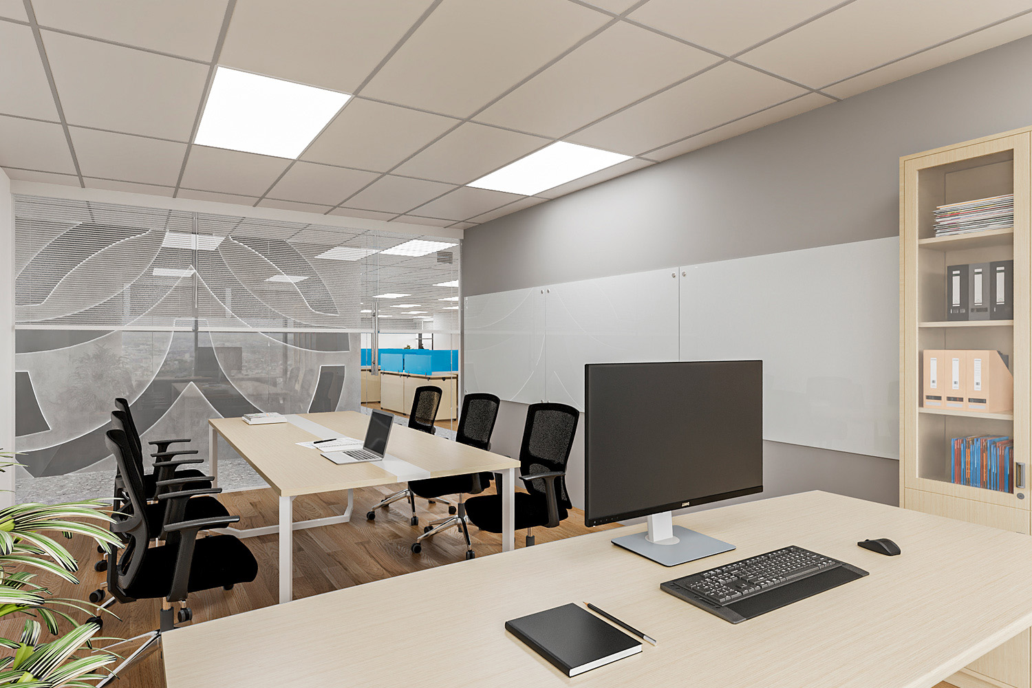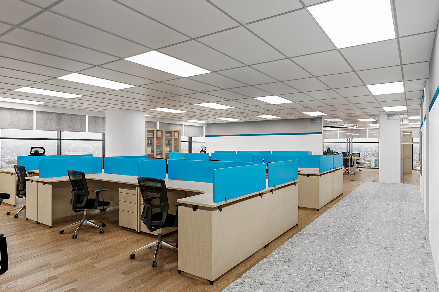 Thách thức: Đảm bảo độ sáng đồng đều trên toàn bộ khu vực làm việc rộng. Thi công hệ thống sàn thảm và vách ngăn module chuẩn xác để tối ưu không gian cho từng nhân viên.