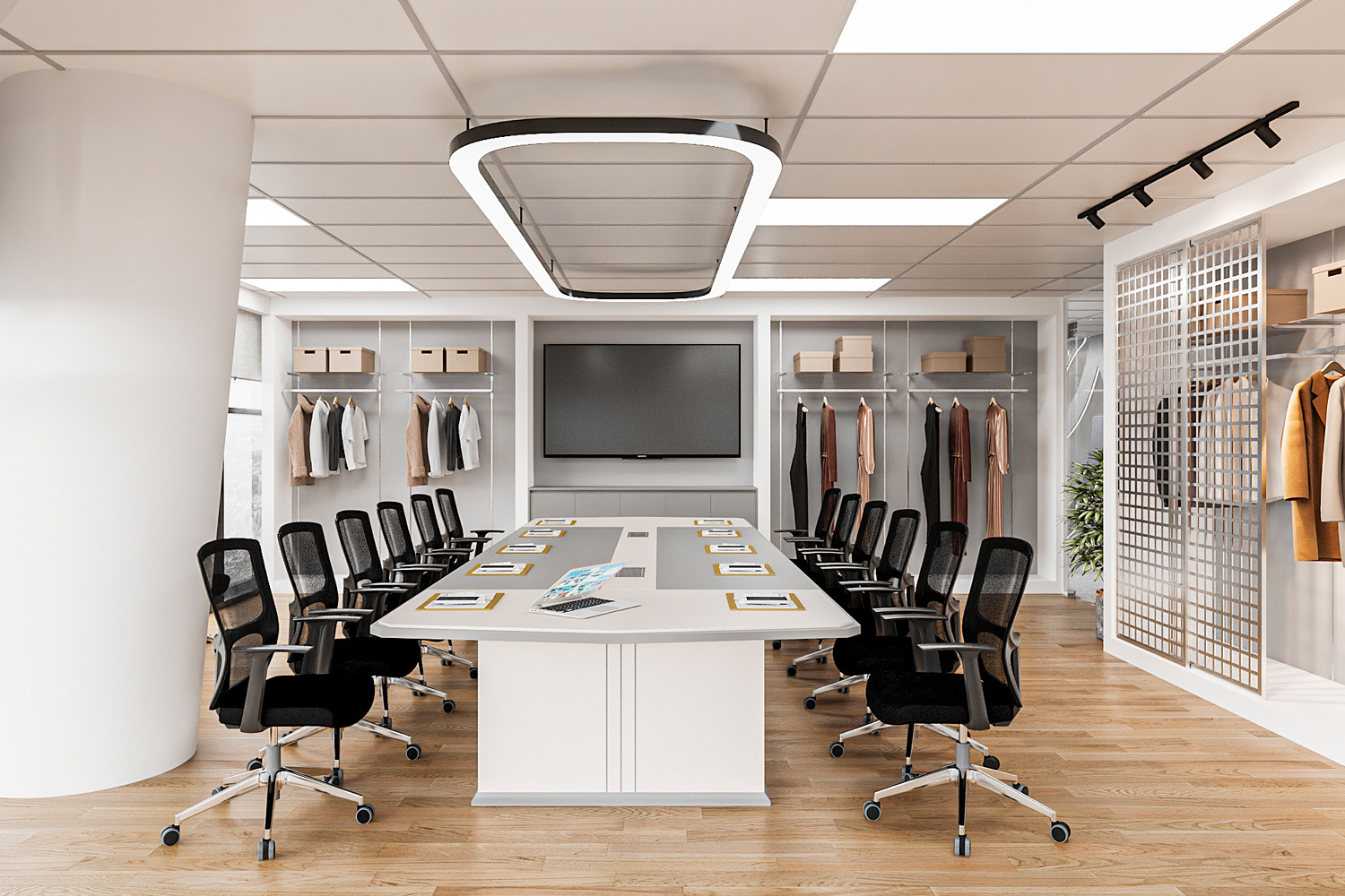 Nội thất: Sử dụng bàn họp mặt trắng hoặc gỗ sáng, ghế xoay màu đen để tạo sự tương phản và tập trung.